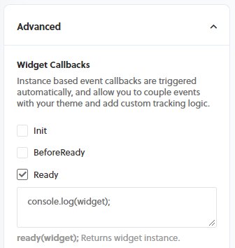 --- title: Methods excerpt: JavaScript methods for controlling widget display and cart interactions deprecated: false hidden: false metadata: title: '' description: '' robots: index next: description: '' --- The widget methods are scoped to each widget specifically. The widgets are placed in an array nested within the global Rebuy object so when using methods for a specific widget you can use the Array.find() function (example below) or any other array function that you prefer. This is not a complete list of the globally available function but the ones that we find most helpful. ```javascript title="Find widget" const widget = window.Rebuy.widgets.find(widget => widget.id === "1234"); ``` All methods below are as if there is a reference to a specific widget such as the snippet below or if the code snippet is in one of the widget callbacks from the widget settings page under the Advanced settings such as the image below. ```javascript title="Widget reference" const widget = window.Rebuy.widgets[0]; ```  ## addSelectedProductsToCart This function is used with the Product Add-Ons widget. This adds the items that are selected from the widget to the cart. ```javascript widget.addSelectedProductsToCart(data, callback); ``` ## addToCart Makes a post request to Shopify API to add an item to the cart. The first argument expects a product object. ```javascript widget.addToCart(product, callback); ``` ## addToReChargeCheckout Used by the Recharge Checkout widget to add the item object passed in as the first argument and will update the checkout UI. ```javascript widget.addToReChargeCheckout(product, callback); ``` ## cartItemIsWidgetItem Returns a boolean (true) if the item passed in as an argument has been added by the specified widget that is calling the method. ```javascript widget.cartItemIsWidgetItem(item); ``` ## checkout When this function is called, the customer will be redirected to the checkout page. ```javascript widget.checkout(); ``` ## compareAtSubtotal Used by the **Dynamic Bundle** and **Product Addons** widgets to generate a compare at price if there is a discount for any of the applicable products ```javascript widget.compareAtSubtotal(); ``` ## declineOffer Used by the **Upsell**, **Thanks You Page** and **Switch to Subscription** popup type widgets when the customer does not want to accept the offer from presented. ```javascript widget.declineOffer(product, callback); ``` ## destroy This function will destroy and remove the widget, including the root div, at the given index. This function calls hide, detachWidget and unbindEvents. ```javascript widget.destroy(callback); ``` ## detachWidget This function removes the widget from the DOM as well as removes it from the array of widget from window\.Rebuy.widgets. ```javascript widget.detachWidget(); ``` ## getCartProductIDs Returns an array of numbers which are the product ID's of the products in the cart. ```javascript widget.getCartProductIDs(); ``` ## getCartVariantIDs Returns an array of numbers which are the variant ID's of the products in the cart. ```javascript widget.getCartVariantIDs(); ``` ## getVariantIDs Returns an array of numbers which are the variant ID's of the items in the cart. Take an optional boolean (join) as an argument and when true will join as a comma separated string instead of an array of numbers. ```javascript widget.getVariantIDs(join); ``` ## getWidgetProducts This method will force the widget to fetch new products via the API, and accepts an optional callback function. This is useful if you'd like to update product or variant IDs associated with the widget and then fetch a new API response. In practice, you could update the variant ID based on a customer's interaction with the product page form and fetch variant-specific recommendations. ```coffeescript title="JavaScript" widget.getWidgetProducts(callback): ``` ```coffeescript title="Examples" // Set Shopify variant IDs widget.data.shopify_variant_ids = [1234567890]; // Fetch new data with the updated variant IDs widget.getWidgetProducts(()=>{ console.log("New products fetched!"); }); ``` ## hasQuantityInputEnabled Returns a boolean (true) when the widgets quantity input setting is enabled. ```javascript widget.hasQuantityInputEnabled(); ``` ## hasTimer Returns a boolean (true) when the widgets timer setting is enabled. ```javascript widget.hasTimer(); ``` ## hide Used by **Popup** type widgets and will close the widget when this method is called. ```javascript widget.hide(); ``` ## isCartBasedWidget Returns a boolean (true) when the widget is a cart based widget as opposed to a product page widget. ```javascript widget.isCartBasedWidget(); ``` ## productIsSelected Used by the Dynamic Bundle and Product Addons widgets. Returns a boolean (true) when the checkbox is selected. ```javascript widget.productIsSelected(product); ``` ## removeFromCart Original use case: Used by the Shopify checkout and Recharge checkout widget to remove an item from the cart that has been added by the widget. When in checkout, if an item is added by a Rebuy checkout widget then the item will have a (remove) button below it. This way, if the item was added accidentally the customer does not need to navigate back to the cart page to adjust the item that was added. ```javascript widget.removeFromCart(product, callback); ``` ## render When this method is called and the widget should display based off the connected rules then it will render by creating a new Vue instance for the widget. ```javascript widget.render(); ``` ## selectedProductCount Used by the Product Addon and Dynamic bundle widget. Returns a number which is the amount of products that are currently selected. ```javascript widget.selectedProductCount(); ``` ## shouldDisplay Returns a boolean (true) if the widget should display according to the connected data source. ```javascript widget.shouldDisplay(); ``` ## show This method will make a **popup** type widget display when it is called. The **popup** widget can be set 